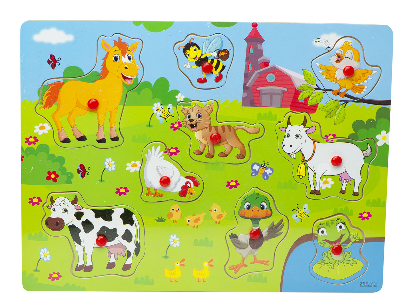 Medinė dėlionė su rankenėlėmis, padedanti vaikui išmokti naujų įgūdžių.